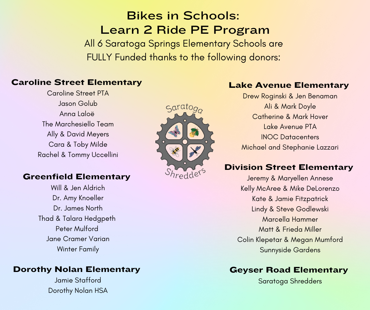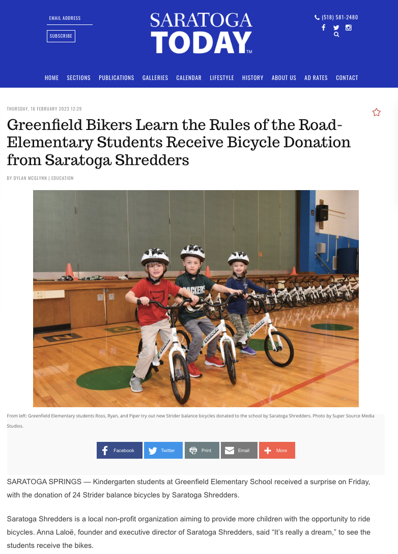 In February 2023, we piloted a Learn 2 Ride Strider program in Kindergarten classes at Greenfield Elementary. In March we funded this program for Caroline Street Elementary School, and by May of 2023, we were able to fully fund programs in all 6 of the Saratoga Springs Elementary Schools, in September, 2024, we rolled out a fully funded middle school program and in July 2025, we now have a fully funded High School program. The first K-12 Bikes in Schools program in the nation!